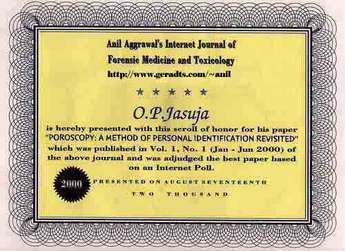 Anil Aggrawal's Internet Journal of Forensic Medicine and Toxicology awards a scroll of honor for the best paper published in every issue. The best paper is decided not by a jury or a judge, but by the readers themselves, through an internet poll. From Volume 1, Number 2 (July - December 2000), an award for best thesis/dissertation is also being given.