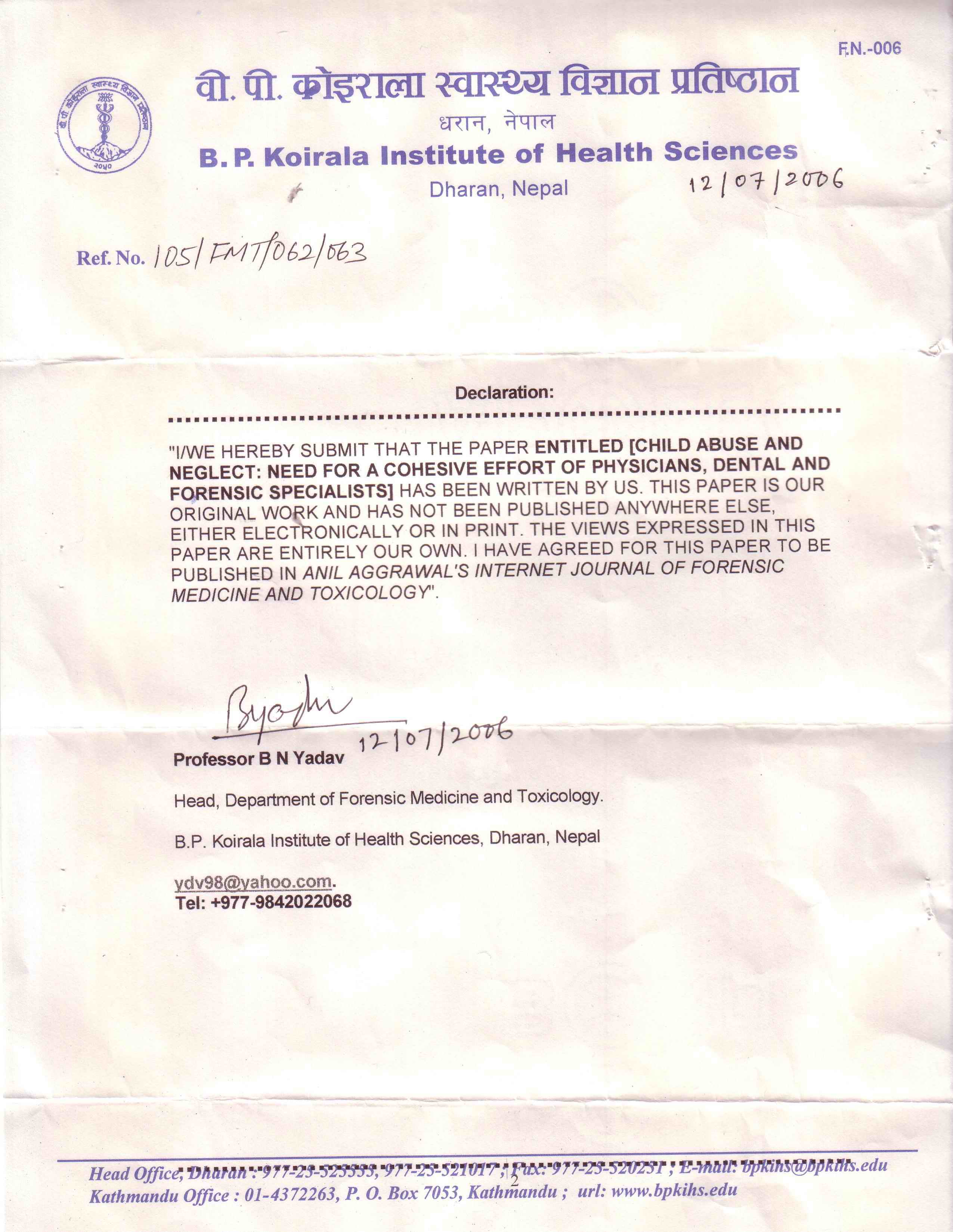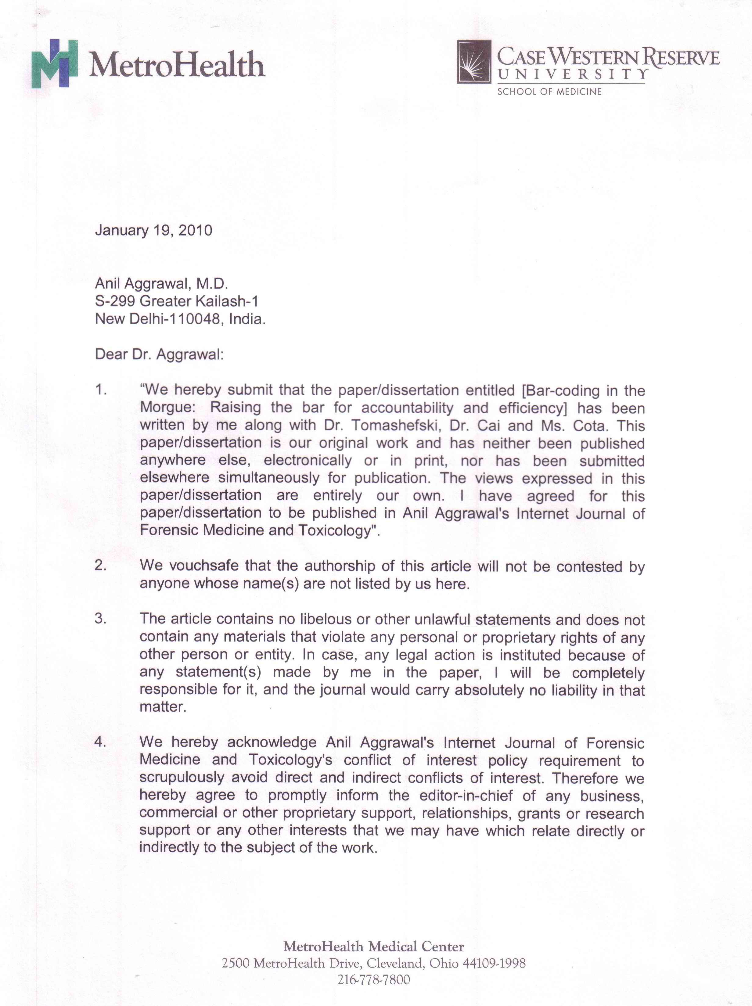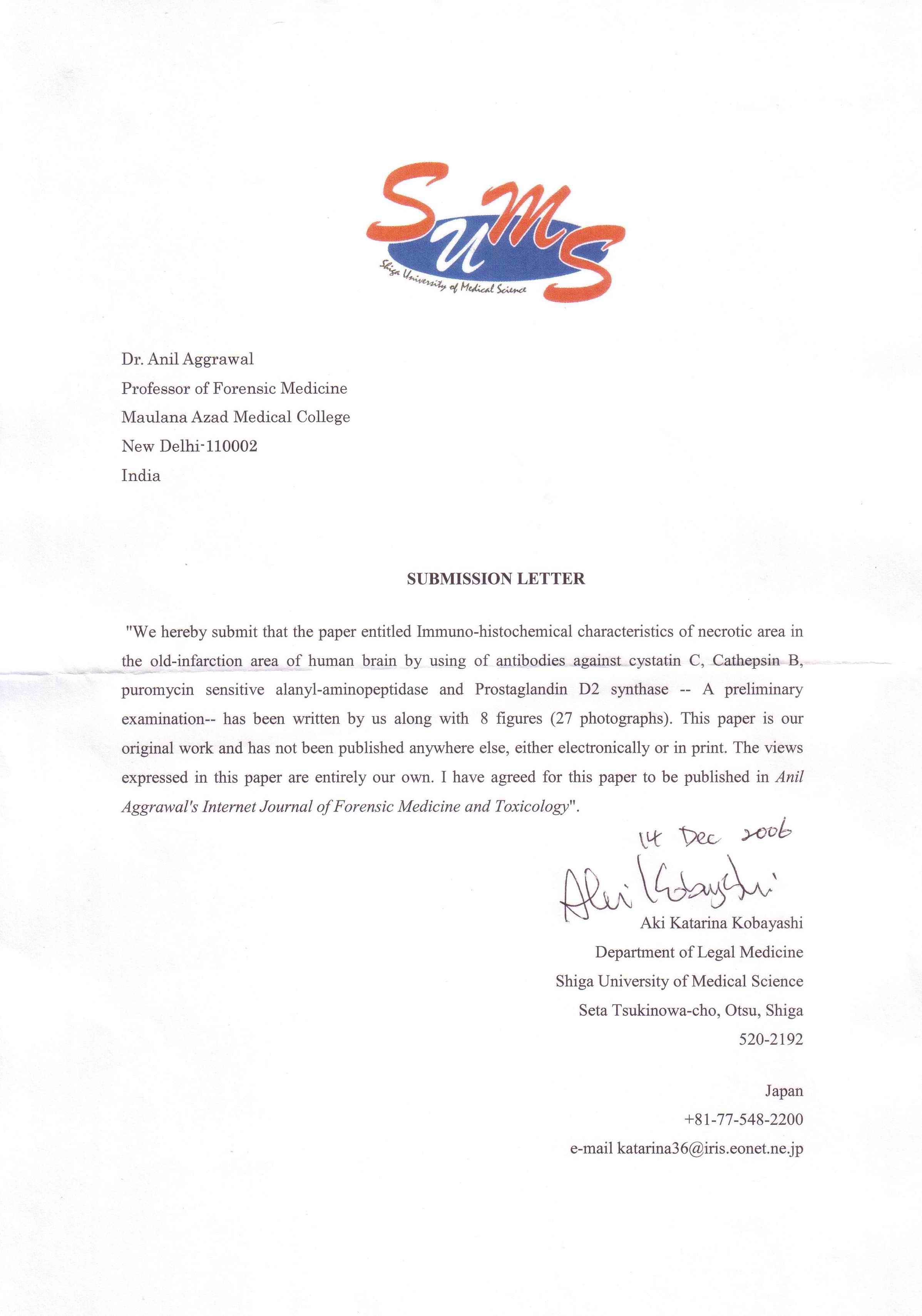 SUBMISSION LETTER1. "I/We hereby submit that the paper/dissertation entitled [please give name of the paper/dissertation here] has been written by me/us along with [please include number of photographs here (write 0 if no photograph accompanies the paper)] photographs, [please include number of audio files here (write 0 if if no audio file accompanies the paper)] audio files and [please include number of video files here (write 0 if no video file accompanies the paper)] video files. This paper/dissertation/audio and visual files are my/our original work and has neither been published anywhere else, electronically or in print, nor has been submitted elsewhere simultaneously for publication. The paper has not been rejected previously by any journal*. The views expressed in this paper/dissertation/ audio and video files are entirely my/our own. I have agreed for this paper/dissertation/audio and video files to be published in Anil Aggrawal's Internet Journal of Forensic Medicine and Toxicology".*[Declaration whether the manuscript has been rejected by another journal - If the paper has been rejected by another journal/s previously, please omit the sentence "The paper has not been rejected previously by any journal". Instead, please state here "The paper has been rejected previously by journal/s entitled 'XYZ'". Please also submit the reviews or editorial statements forwarded to you by the journal/s along with a copy of the rejection letter / copy of the email rejecting the paper.] 2. I/we vouchsafe that the authorship of this article will not be contested by anyone whose name(s) is/are not listed by me/us here. 3. I/we vouchsafe that I/we have gone through all papers cited by me/us in the references section. I/we also understand that if requested by the reviewers for cross-checking facts stated in the paper, I/we would be able to send a pdf/scan/photocopy of the paper. 4. The article contains no libellous or other unlawful statements and does not contain any materials that violate any personal or proprietary rights of any other person or entity. In case, any legal action is instituted because of any statement(s) made by me in the paper, I will be completely responsible for it, and the journal would carry absolutely no liability in that matter. 5. I/we hereby acknowledge Anil Aggrawal's Internet Journal of Forensic Medicine and Toxicology's conflict of interest policy requirement to scrupulously avoid direct and indirect conflicts of interest. Therefore I/we hereby agree to promptly inform the editor-in-chief of any business, commercial or other proprietary support, relationships, grants or research support or any other interests that I/we may have which relate directly or indirectly to the subject of the work. 6. I/we also agree to the authorship of the paper in the following sequence: