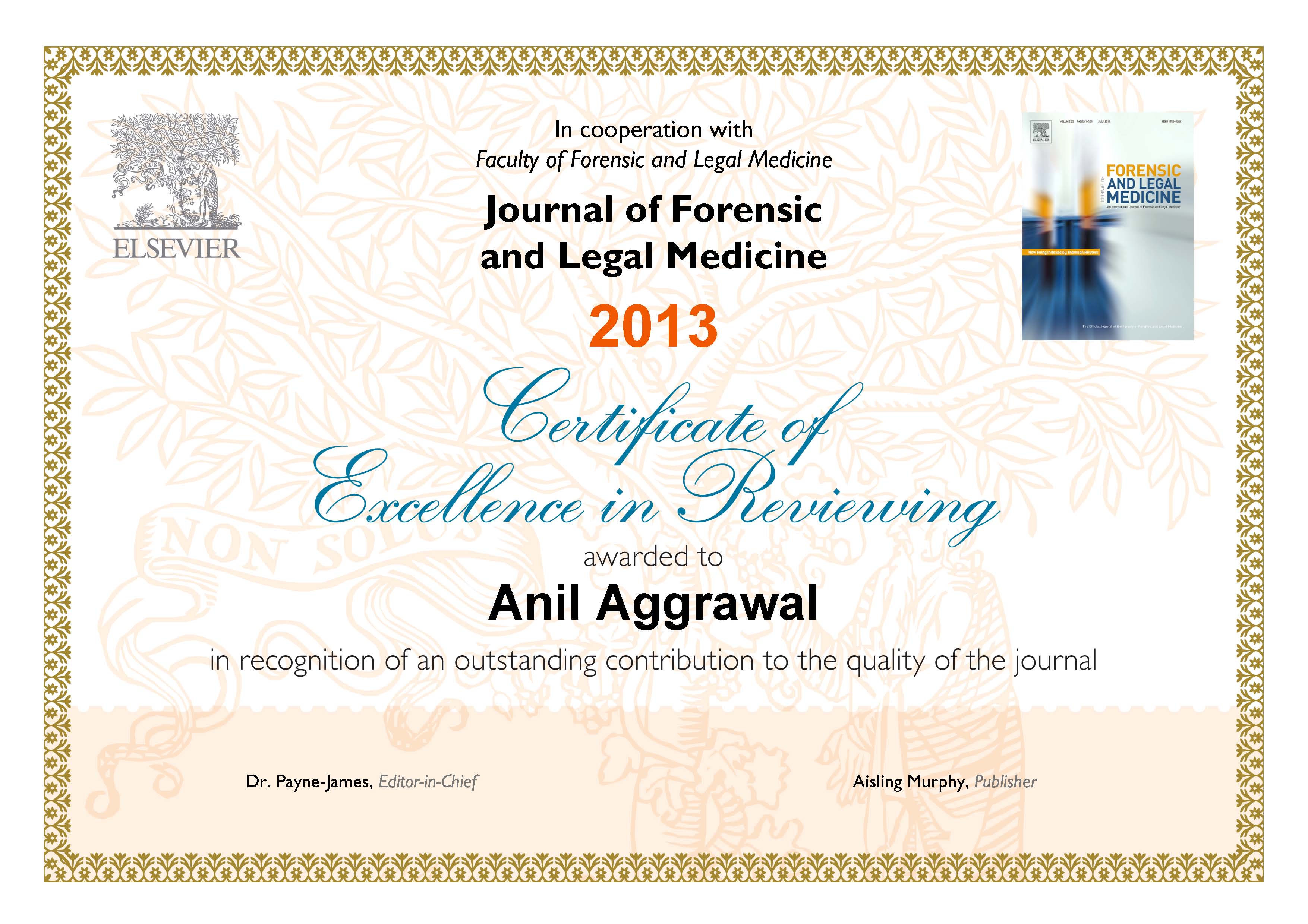 Anil Aggrawal's Internet Journal of Forensic Medicine and Toxicology is published online twice a year. It is the world's first online journal of forensic medicine and toxicology. Started by Professor Anil Aggrawal of Maulana Azad Medical College, New Delhi, on 25 February 2000, it publishes original on forensic medicine, toxicology, medical law, science and the law and allied subjects such as criminology, police science, deviant behavior, forensic psychiatry and psychology. Any subject that has a forensic interest e.g., forensic astronomy, forensic economics, forensic geoscience, forensic gemology, forensic herpetology, forensic hypnosis, forensic limnology, forensic linguistics, forensic mathematics and statistics, forensic metallurgy, forensic microbiology, forensic microscopy, forensic nursing, forensic palynology, forensic pharmacy, forensic phonetics, forensic social work, jurimetrics, nanoforensics, teleforensics, veterinary forensics, wildlife forensics etc., as well as papers related to medicolegal aspects of various medical disciplines, such as pediatrics, surgery, ENT, ophthalmology etc. are also published. The journal has regular undergraduate and postgraduate sections, book reviews, interviews with famous forensic professionals, poster sessions, announcements of conferences etc. All back issues are archived for easy access and are available to all. The journal has an impressive editorial board comprising of at least one specialist from every single continent of the world. About 10,000 visitors visit and read the journal daily from all parts of the world. The journal is indexed/listed with several major abstracting services such as Chemical Abstracts Service, EMBASE, Index Copernicus, SCOPUS, and Web of Science [Clarivate (formerly Thomson Reuters)]. For more information, please visit following link.
