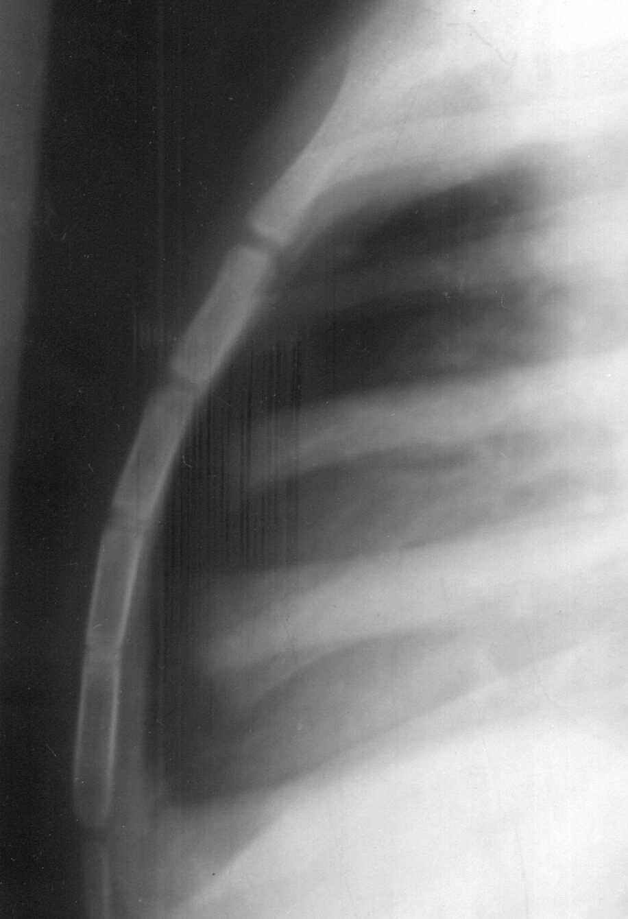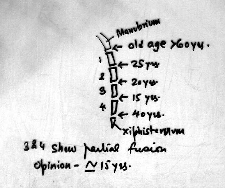 This is usually a neglected bone even by forensic practitioners engaged in the determination of age. But it can give strikingly accurate ages. Figure 1 is an example. This case was brought to the author for age estimation. A lateral X-ray of chest was advised. All the four pieces of sternum can be seen clearly.