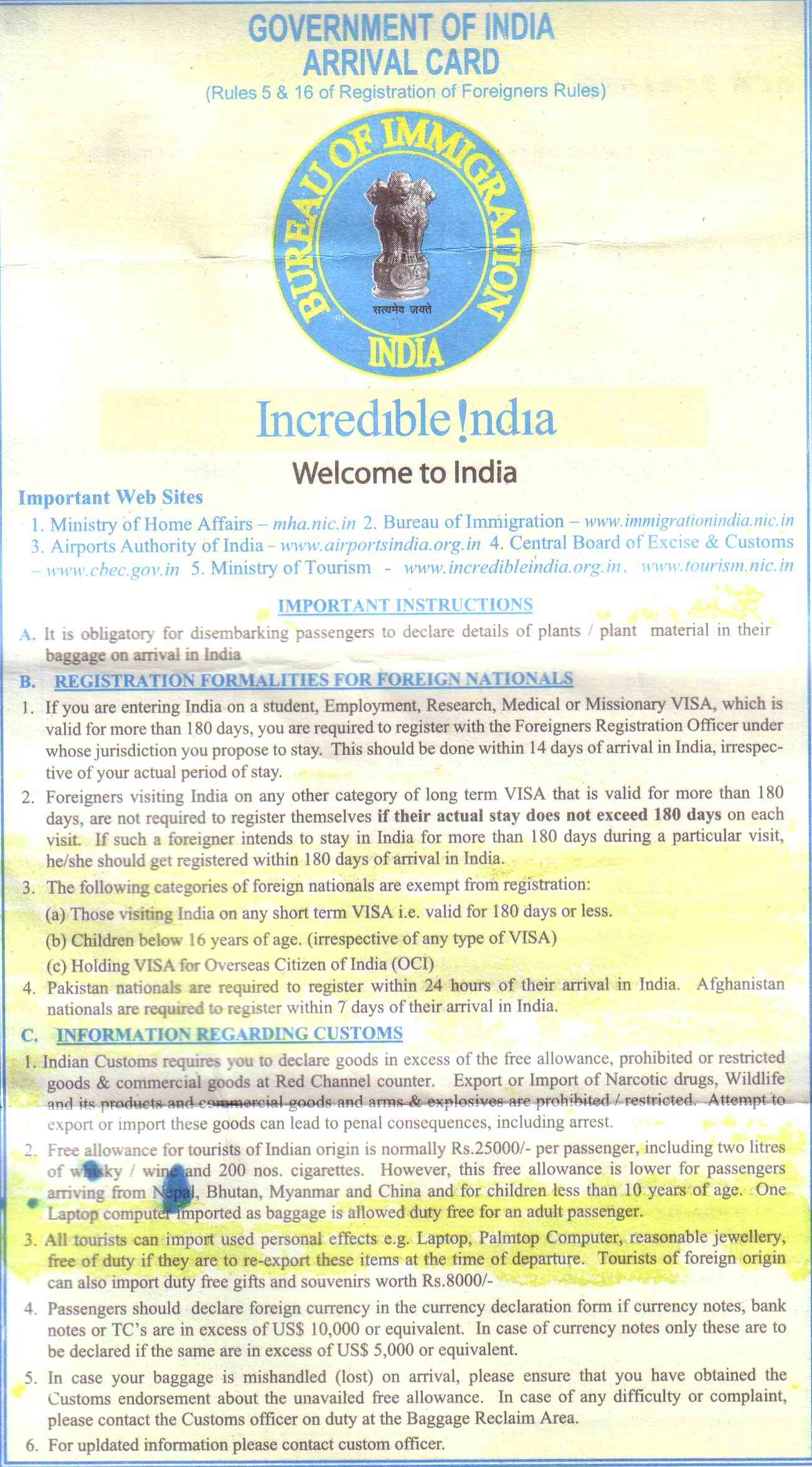 Government of India arrival card, which all overseas tourists arriving in India, and Indians returning back to India have to fill up. Please see rule 2 in section C. (Please Click to enlarge).