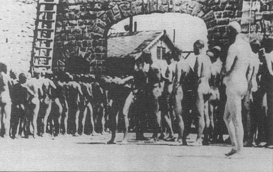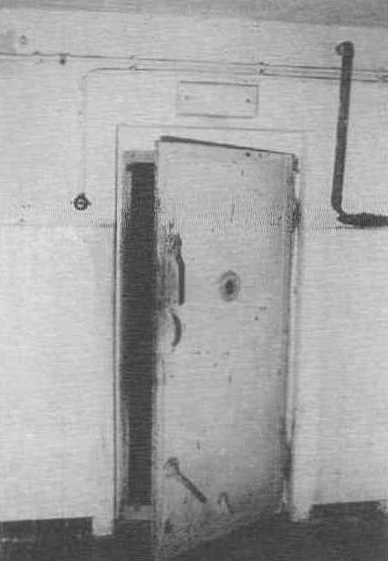 When prisoners arrived, they were instructed to take off all their clothes and leave valuables at the "valuables ticket office." Prisoners' hair was cut off in the barber's barrack, and they were then marched under the gun to the gas chambers (Figure 2.13, above right). They stood stark naked and were told by an SS officer that no harm would come to them. "You just have to breathe very deeply, that strengthens the lungs, inhaling is a means of preventing contagious dis¬ease. It's a good disinfection". They were packed into the gas chambers, and the doors were shut. Exhaust fumes from a diesel en¬gine filled the room. SS doctors and professors like Wilhelm Pfannenstiel, a medical doctor and professor of hygiene at the University of Marburg/ Lahn, and others watched through specially constructed peepholes on the door of the gas chamber (Figure 2.14, left). Metal grids covered the peepholes so that the people inside could not try to break it to get air. After the prisoners died, dentists were sent in to hammer out the gold teeth bridges and crowns while others inspected anuses and genitalia for hidden wealth. Whatever valuables were found were sold.