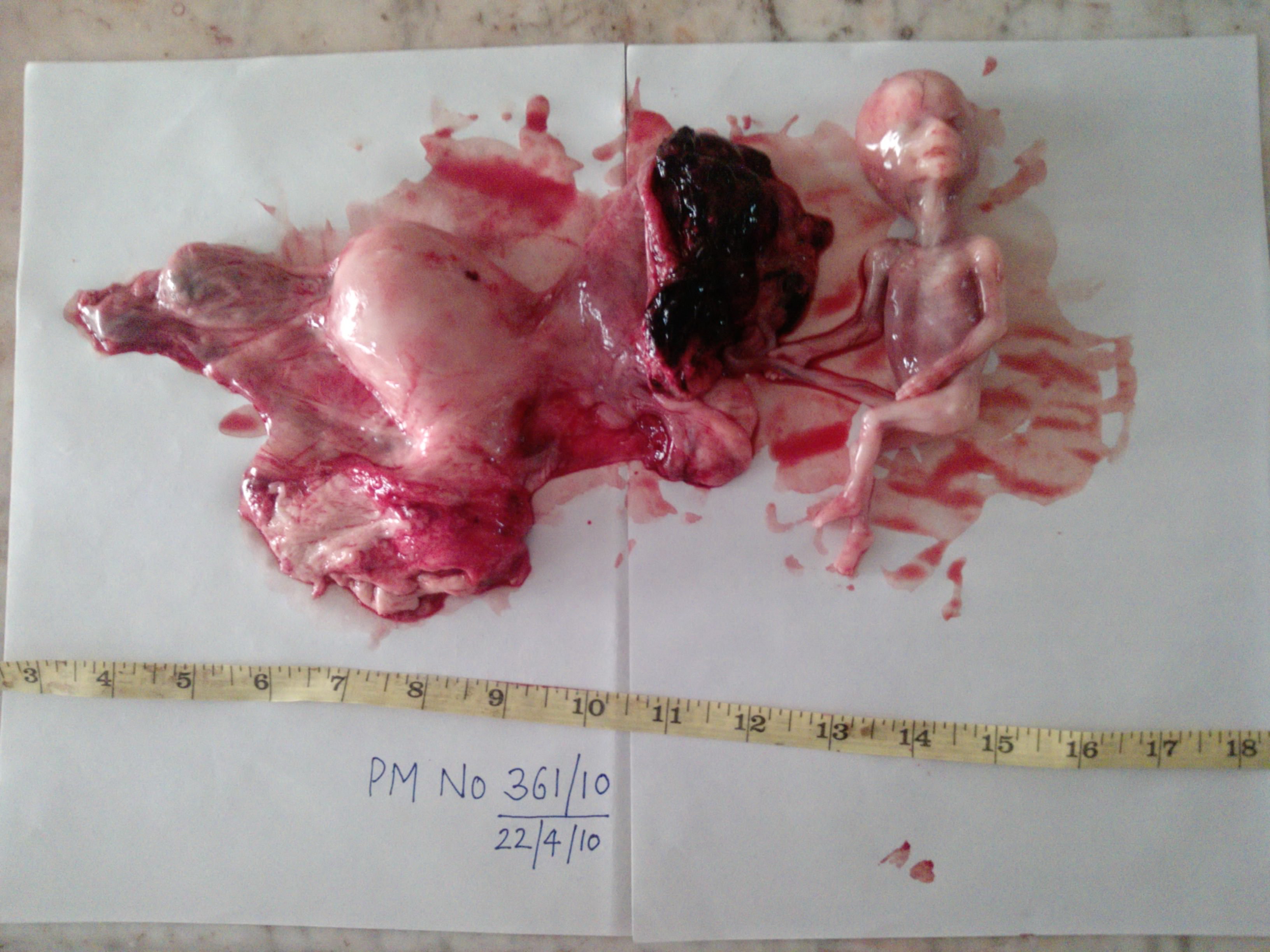 The deceased was a resident of rural region some 30 km away from our hospital. She had a complaint of pain in abdomen. While she was brought to the hospital for treatment she died. The ruptured pregnancy caused intra abdominal hemorrhage causing death of the woman. It is one of the causes of sudden death. See the size of the fetus. It was about nine cm. The duration of pregnancy could well be about three months or so. Such pregnancy and its ectopic nature should have been diagnosed early and appropriate treatment could have been initiated saving the life of woman. Many times it does not become possible in rural set up in India.