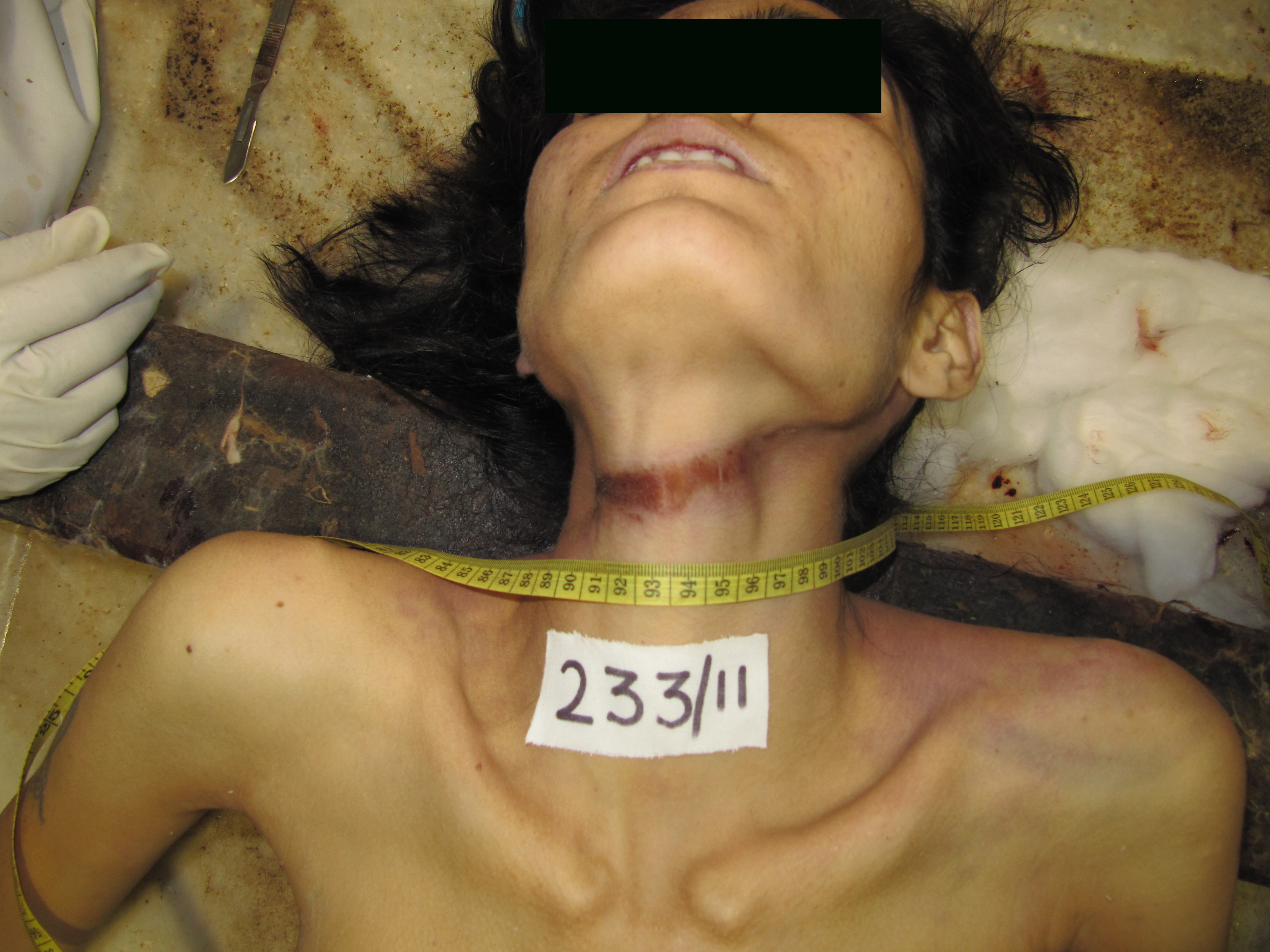 It was a case of death of 23 year old married female due to hanging. Unusual finding is seen on the left sole. See photograph-1 there was an obliquely placed railroad bruise.