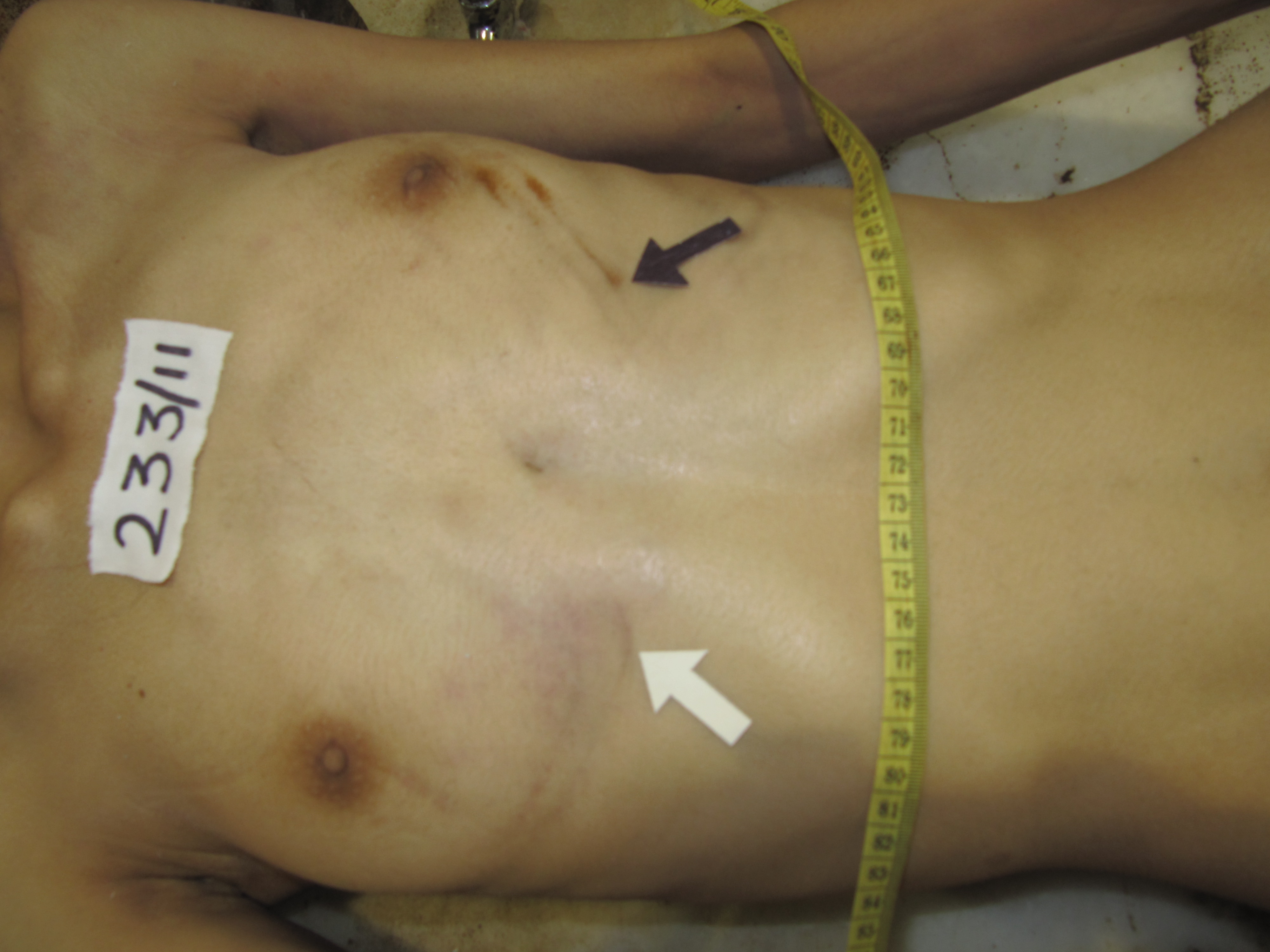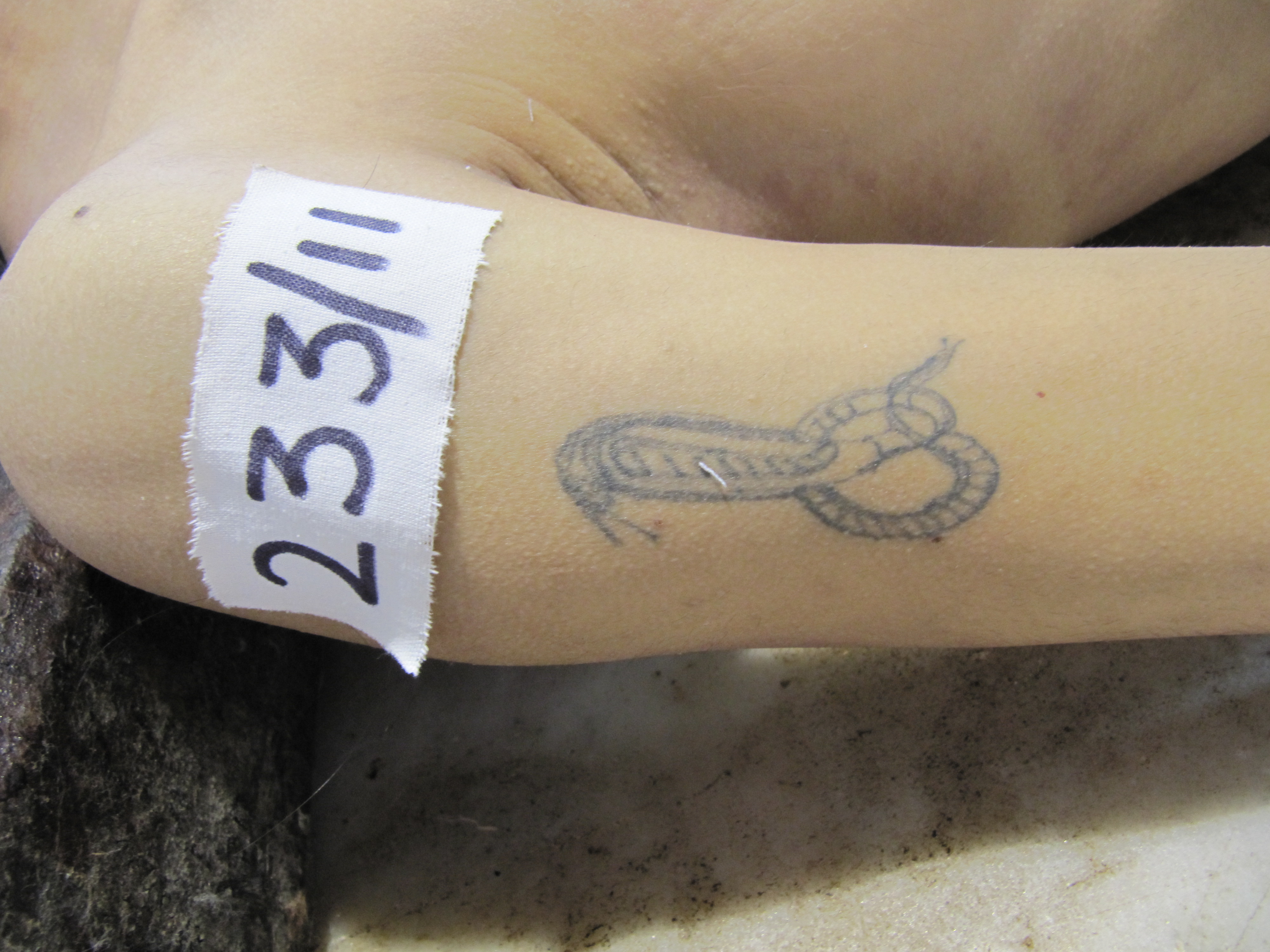 The photograph was kept for discussion in the department. Burns due to solid object that is branding, electrocution and mark produced by keeping the body in cold room tray were raised by faculty members. They were excluded one by one.