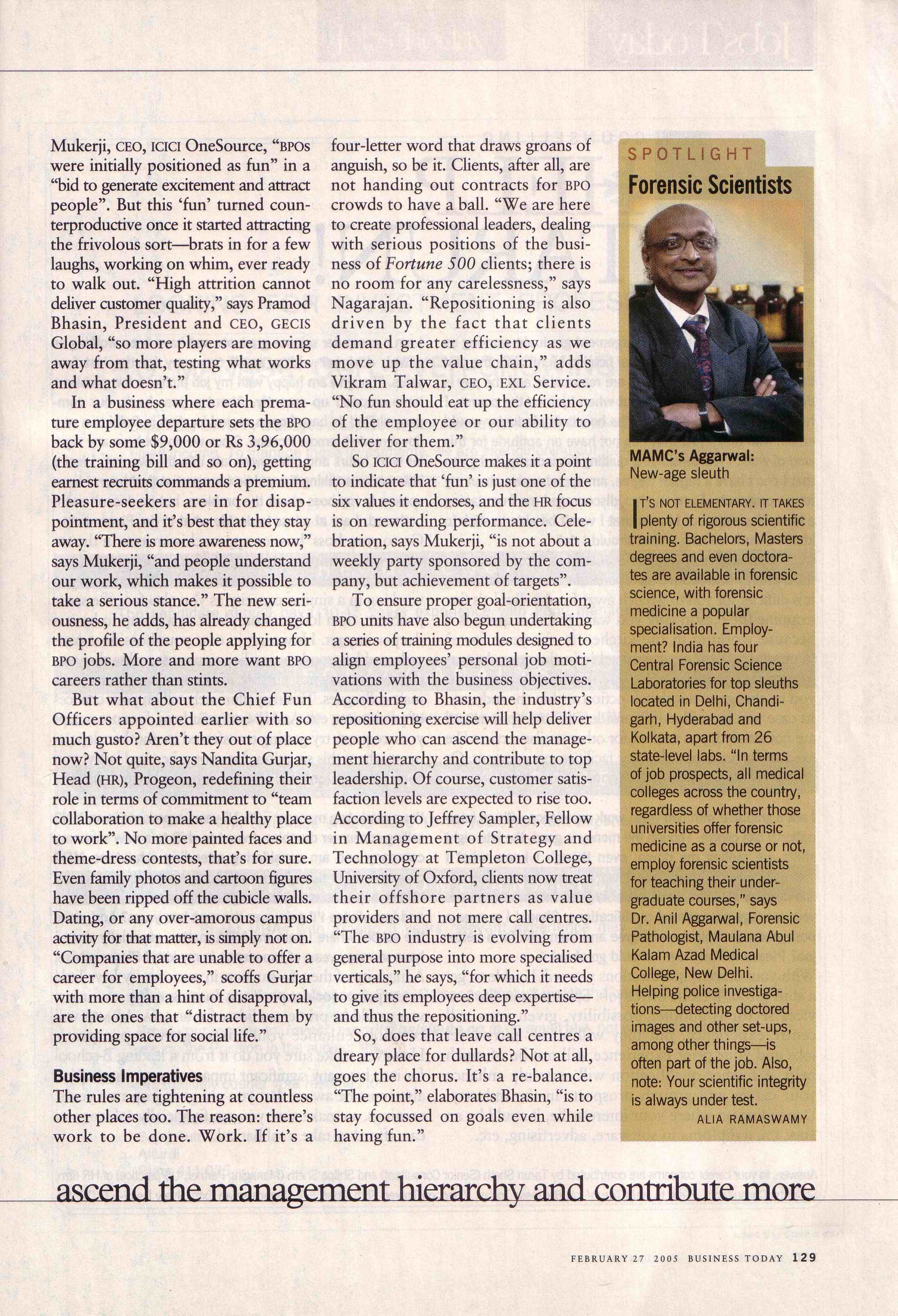There is a great need of Forensic Scientists today around the world, especially in India. Business Today of February 27, 2005 ran a special article on "Need for Forensic Scientists" in their column "Jobs Today". I have scanned that complete article and am producing it here for the benefit of all. The images you see are in low resolution. Click each image to get a high resolution image so you can read the article. Or right click on each image and then click "Save Link As..." to save the high resolution picture, which you can then read in your favorite picture program.