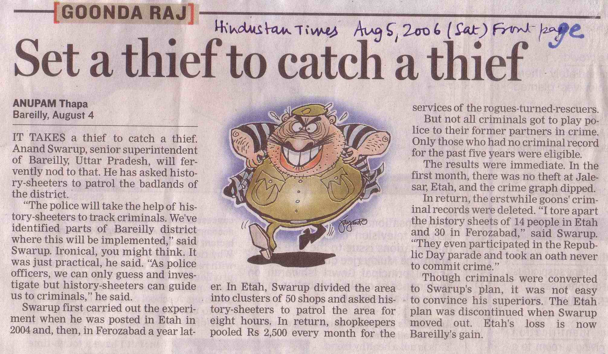 You might think these types of things used to happen in the past only and perhaps are no more followed in the modern 21st century, and you would be wrong! For confirmation, please see the cutting from a leading Indian newspaper of India, The Hindustan Times of August 5, 2006 (Saturday). Read how a senior police officer of India is employing the same methods as those used by Vidocq two centuries earlier.